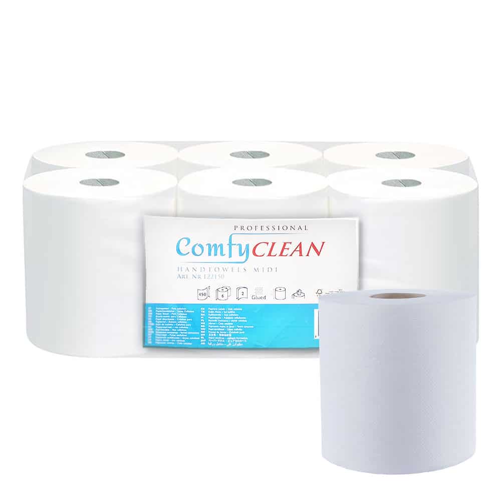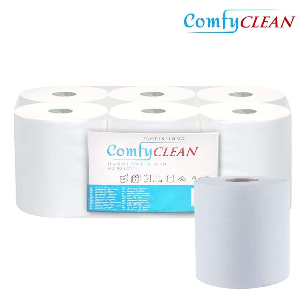 Handtuchrollen Mittelgroße Professional Comfy Clean Papierhandtücher bieten Ihnen eine Kombination aus hoher Qualität, Komfort und Effizienz. Sie sind ideal für den Einsatz in stark frequentierten Bereichen mit hohem Bedarf an Papierhandtüchern